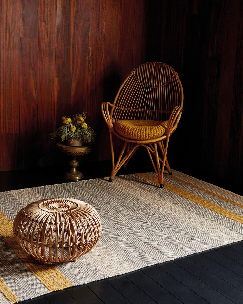 Herringbone patterned flatweave with an eye-catching horizontal stripe. Hand woven. n50% Wool/ 35% cotton/ 15% viscose. Made in India. |